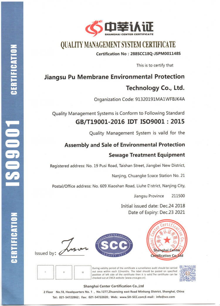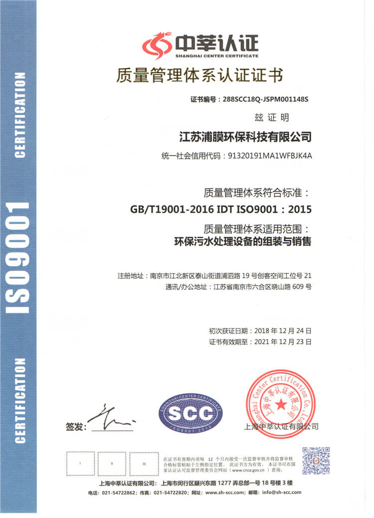 質量管理體系認證證書 證書編號:288SCC18Q-JSPM001