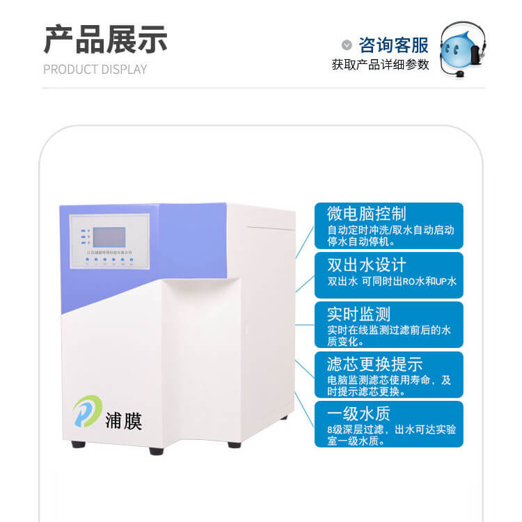 1.全自動壓力傳感器和微電腦控制工作,實現自動制造純水,人性化操作顯示系統。